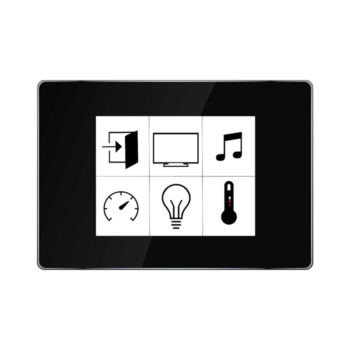 Écran tactile couleur TFT qui permet la visualisation et la commande des appareils domotisés ainsi que le paramétrage des températures, horloges, audio, etc. Il intègre : sondes de température, d’humidité, connexion Ethernet et code d’accès. Cet écran permet également de visionner des caméras IP, le flux de vidéophones et d’écouter vos webradios favorites.