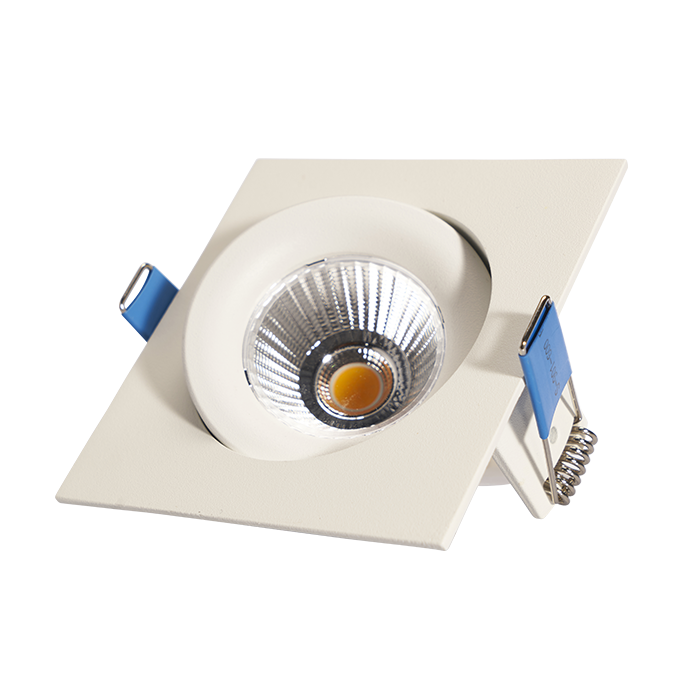 Spot encastré orientable, dim to warm (de 3000 à 2000 K) avec LED de 7W, de forme carrée. À utiliser avec la solution d’éclairage basse tension Domintell LightBus avec câble bus dédié (DCBLXX), une interface (DDIMLV01) et un driver-dimmer dédié (DLBDXX) afin d’assurer un dimming parfait (0 à 100%).